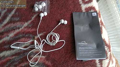 These are all the things included inside the box : Double Info sheet mentioning Harman Kardon the first refers to security reasons of using it and the second for littering into waste . More than 40 languages are included into the folded paper except Greek. Earphones are bonded with a twist tie nearby the plug and finally a set of tips of two types of width .The standard tips were OK for me